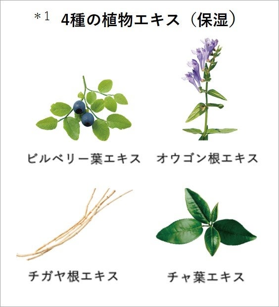 *2 4種の植物エキス:ビルベリー葉エキス、オウゴン根エキス、チガヤ根エキス、チャ葉エキス:保湿