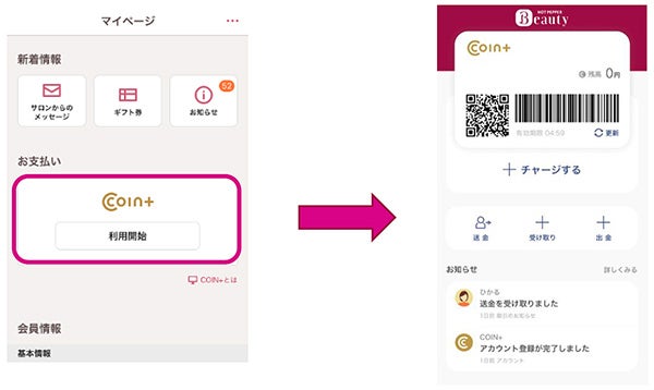 ・美容サロンでの支払い時は『ホットペッパービューティー』アプリのマイページから『COIN+』のマークをワンクリックして利用可能
