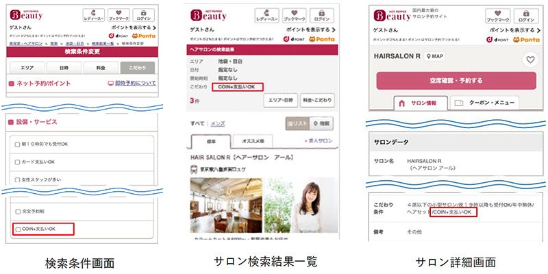 ・『ホットペッパービューティー』で、こだわり条件「COIN+支払いOK」を選択すると、『COIN+』支払い対象サロンの検索が可能