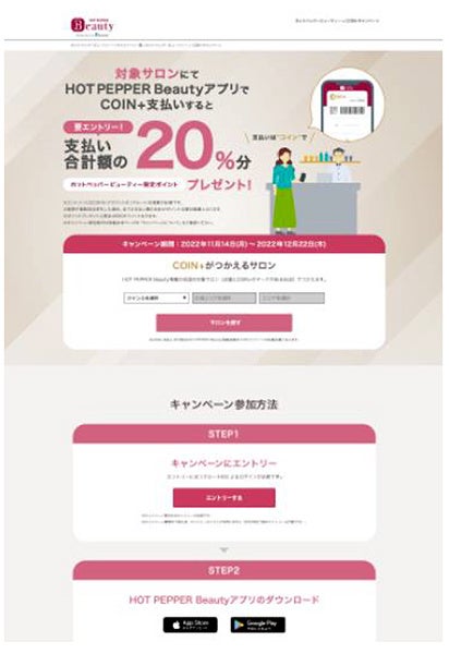 株式会社リクルート(本社:東京都千代田区、代表取締役社長:北村 吉弘、以下リクルート)と、リクルートと株式会社三菱UFJ銀行(本社:東京都千代田区、取締役頭取執行役員:半沢 淳一、以下三菱UFJ銀行)が共同出資する子会社の株式会社リクルートMUFGビジネス(本社:東京都中央区、代表取締役社長:夏目 英治、以下RMB)は、リクルートが運営する、国内最大級のヘアサロン・リラク&ビューティーサロンの検索・予約サービス『ホットペッパービューティー』に、RMBが提供する決済ブランド『COIN+(コインプラス)』を2022年10月19日(水)より順次導入することをお知らせします。これにより、アプリだけでサロンの予約から支払いまでが完結します。なお、2022年11月14日(月)~12月22日(木)の期間中、『ホットペッパービューティー』期間限定ポイント(支払額の20%相当)をプレゼントする『ホットペッパービューティー』×『COIN+』決済キャンペーンを実施致します。