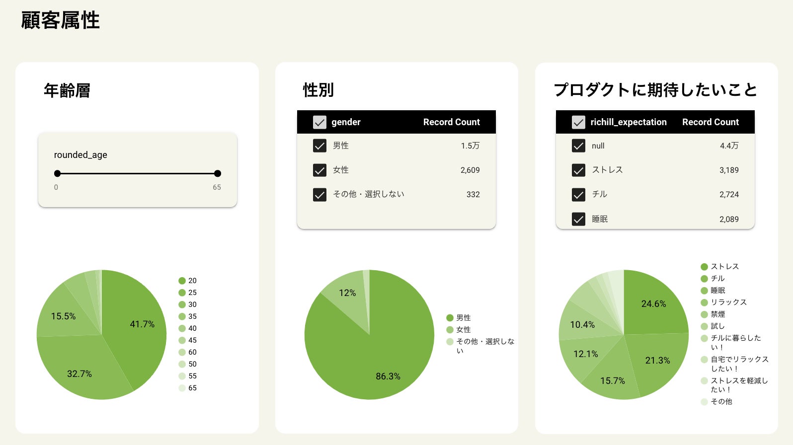 現在のdashboardからは、実際のRICHILL総購入者数、購入者の属性、プロダクトに期待したいことなどを見ることができます。