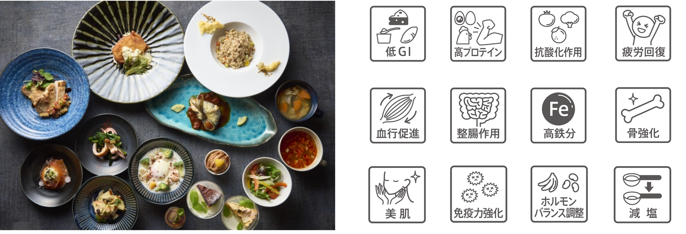 チッコカタメターノを使って南瓜とプラムのタルト仕立てでは、房総半島南部の郷土料理である低糖質、低脂質なのに高タンパクのチッコカタメターノが、低GI食品であり食後の血糖値上昇を緩やかにします。アジのカプレーゼでは、アジに含まれるオメガ脂肪酸であるEPAを多く含み、血液をサラサラにし中性脂肪値を下げる効果があります。マロンクリームムースでは、栗が食物繊維を多く含み、腸内細菌の働きを助け腸内環境を整えます。さらに、食物繊維には血糖値上昇の抑制やコレステロール濃度の低下も期待できます。
