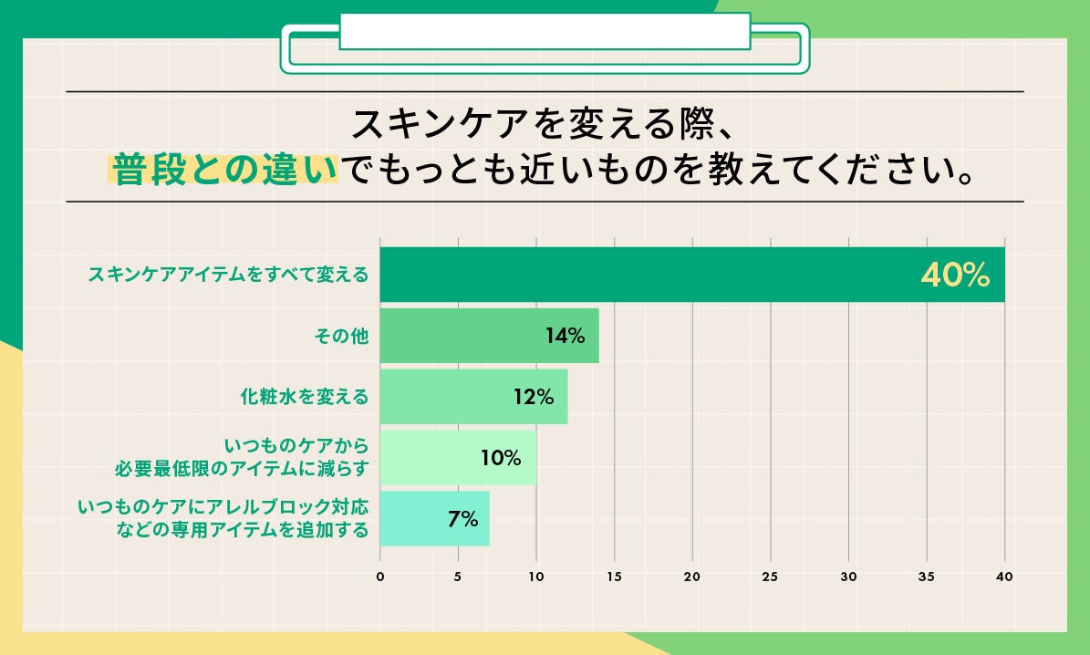 さらに「普段とは違うスキンケアで、もっとも近いものをひとつ選んでください」という質問では、約4割超の人が「スキンケアアイテムを(肌に刺激が少ないものや、保湿力の高いものに)すべて変える」という結果に。
