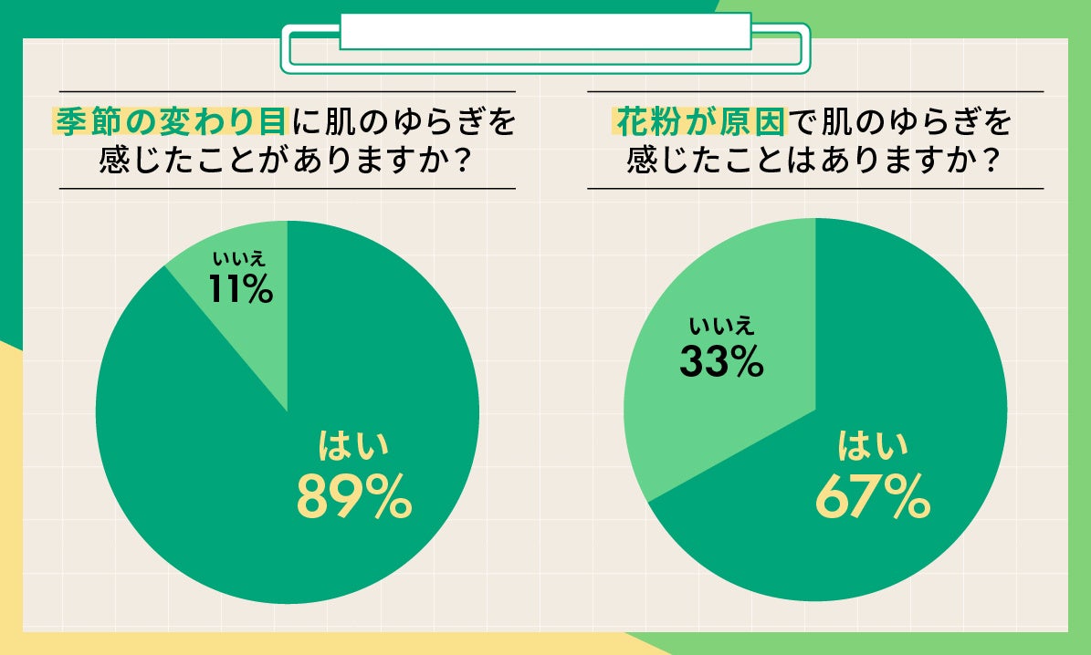 「季節の変わり目に肌のゆらぎを感じたことがありますか?」という質問をしたところ、約9割の人が「はい」と回答。さらに約7割が「花粉が原因で肌のゆらぎを感じたことがある」と回答しました。