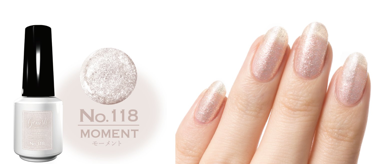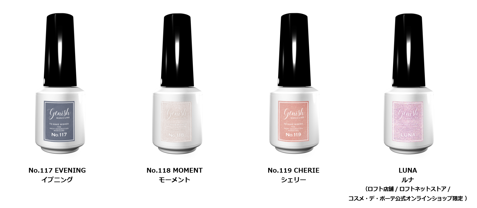 繊細パールがゆらめくシアーブルー「No.117 イブニング」、ピンクの偏光パールとシルバーラメが幻想的な「No.118 モーメント」、ピンクラメが可憐に輝くスモーキーピンク「No.119 シェリー」、イルミネーションのようにラメが眩く煌めくライラックパープル「ルナ」の4色展開です。