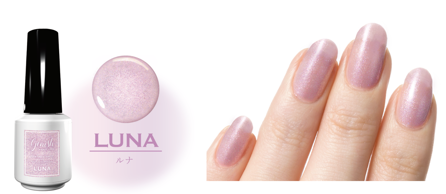 「ルナ」は全国のロフト店舗/ロフトネットストア/コスメ・デ・ボーテ公式オンラインショップ限定で販売いたします。洗練されたラメの輝きと透明感が奥行きを織りなす、表情豊かなジーニッシュのホリデーカラーで特別な一日に彩りを。 *光硬化樹脂