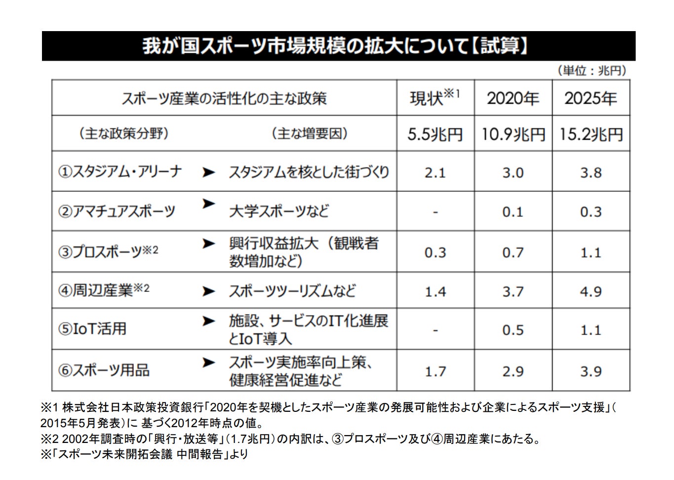 スポーツ庁と経済産業省が2016年に公表した「スポーツ未来開拓会議 中間報告」では、日本のスポーツビジネスの市場規模を、2025年までに15.2兆円まで拡大することを目指し、これは、2012年の約3倍に相当する規模です。