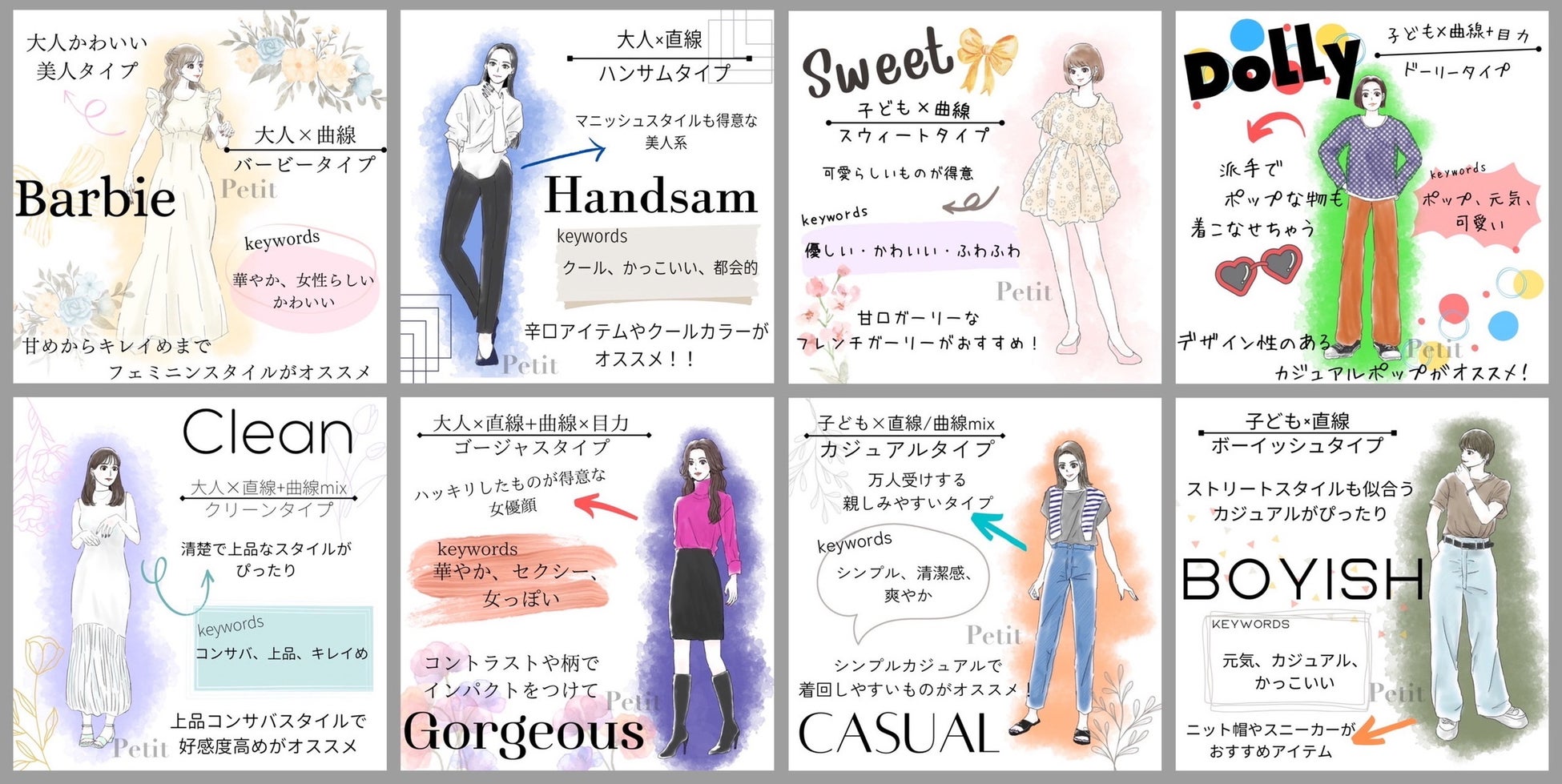 「Petit」のLINE公式アカウントに友達追加をしてくれた方限定で「GlowUp診断」をもとに作成した簡易的な診断を無料体験できます。8タイプに分類した診断結果からあなたに合うパーソナルカラーと顔タイプを見つけることが可能です。