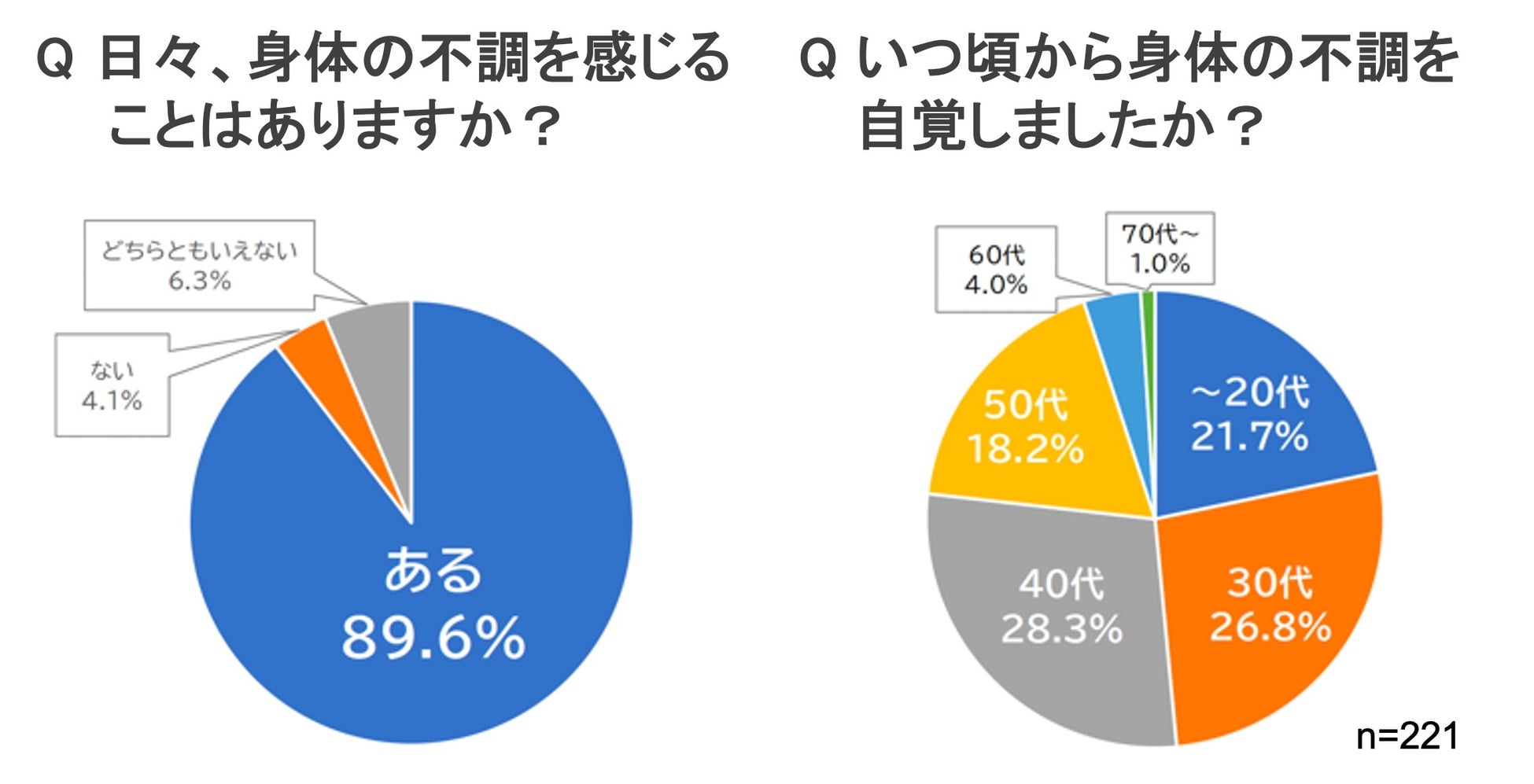 頭痛、肩こり、便秘、不眠症など、慢性的な身体の不調に悩まれている方が多くいらっしゃいます。コミュニティサイト「みんなの眠ラボ」で20代〜80代の男女を対象に行ったアンケート調査(※1)では、約9割の人が「日々、身体の不調を感じる」と回答しました。また、身体の不調を自覚した時期は、50代までにほとんどの人が何らかの不調を感じている結果となりました。特にこれからの季節は、冷えによる不調が生じやすくなります。