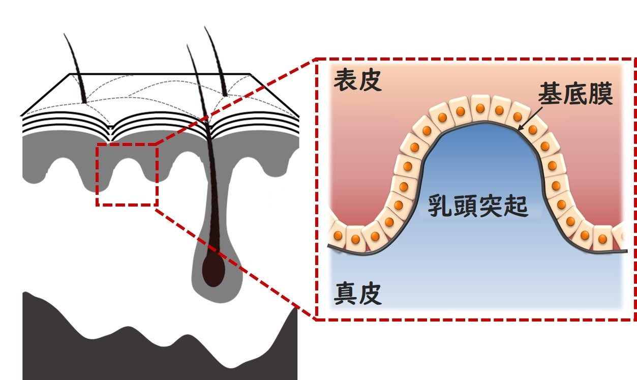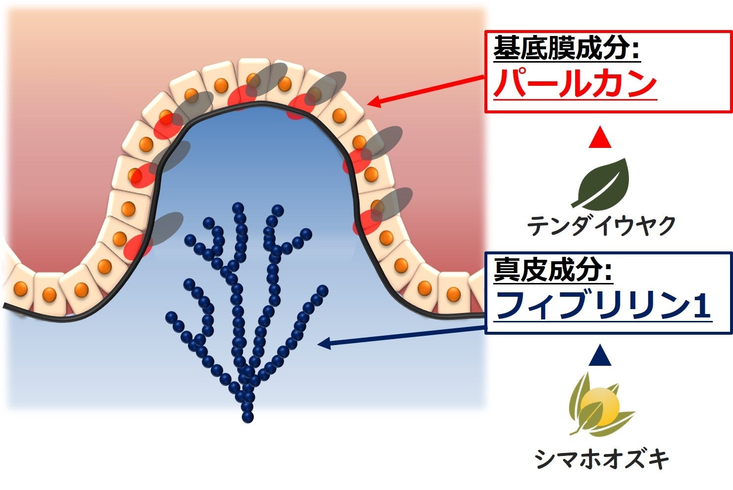 当社は1932年の創業当時から研究開発部門がありますが、1970年代初めから、約50年に渡り、肌のシワ・ハリ・たるみについて研究開発を行い、化粧品を販売してきました。(1973年発売スキンケアブランド 「ガーランドリンクル」)近年では、肌の状態に関して、特に乳頭突起が大きく関与していると考え、研究を積み重ねています。これまでの研究において、基底膜下部の乳頭突起に多く存在するフィブリリン1を増やす「シマホオズキ果実エキス」から、加齢による乳頭突起の構造変化を改善する効果を見いだしています。