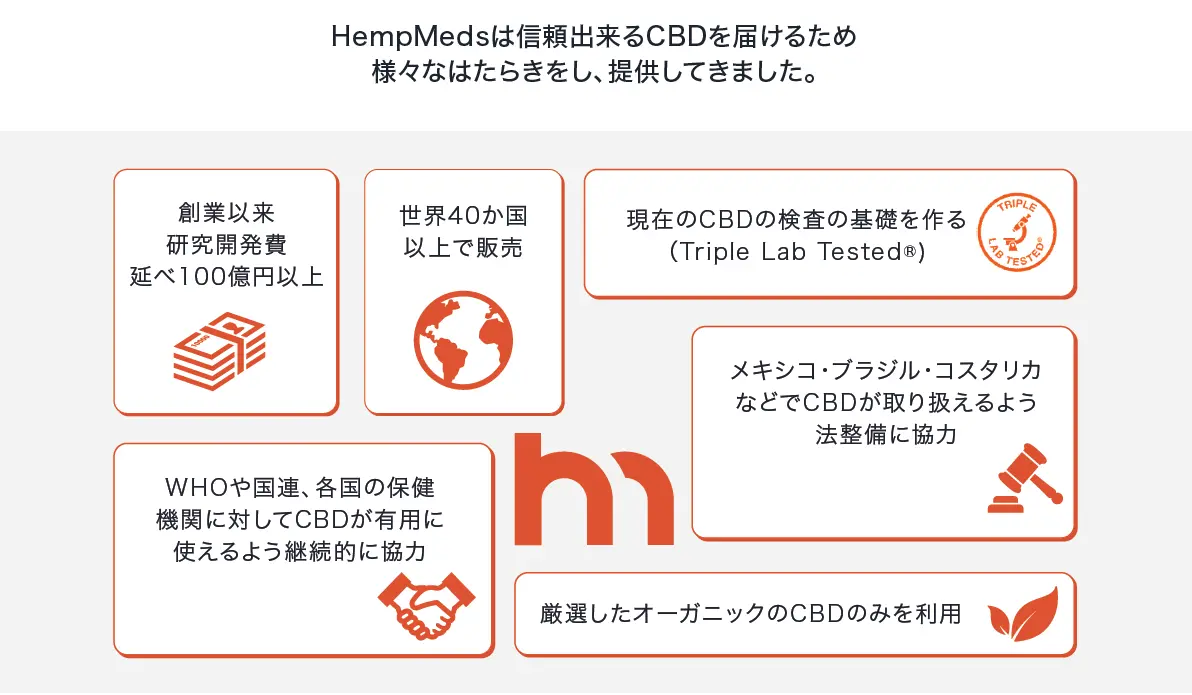 HempMedsは「Your Trusted CBD^(信頼できるCBDを)」と「We are the first®(私たちは初めての会社です)」」をコンセプトに、2012年にアメリカ史上初めてCBDオイルしたCBDのブランドです。40以上の国と地域での販売、研究開発費は延べ100億円超、ブラジルやメキシコでは医療現場でも活躍しています。