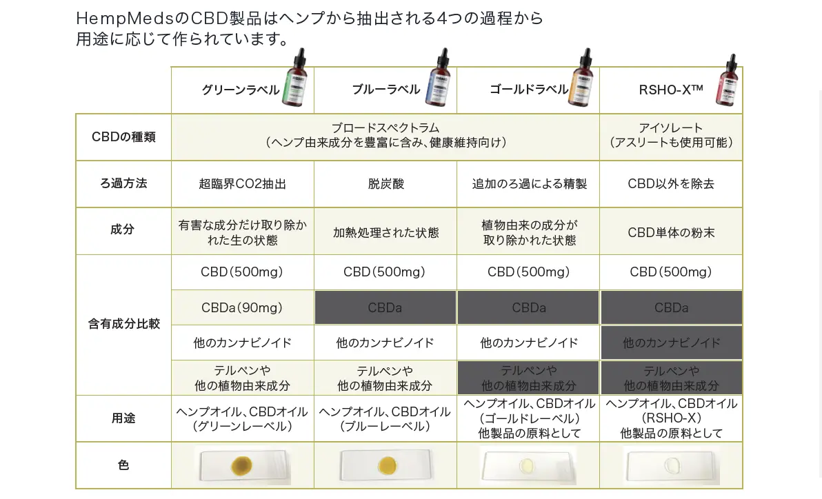 日本では数少ない規格の商品も含め4つのタイプの特徴的なCBDオイルがあります。WADA対応のCBD製品HemMedsではアスリートが使用できる、麻由来の成分の中でCBD単体のみを利用しているWADAの規格に対応している製品も企画、販売しています。
