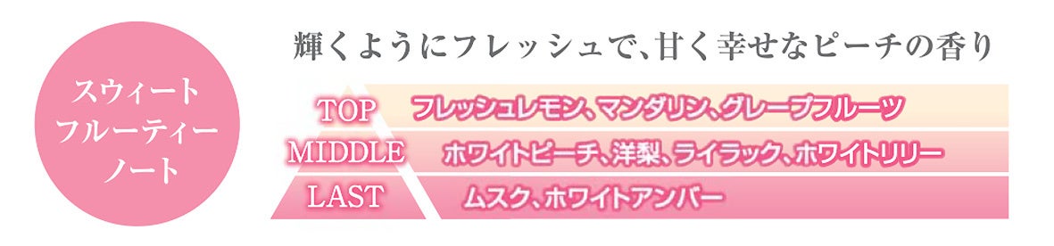 魔法の小瓶のような透明なボトルはキラキラとした輝きを集め、曲線が美しいサムライウーマンの特徴的なキャップが安定感を与えています。この新しいボトルは優しげなモモが幸福感のあるピンク調で彩られたパッケージに収められ、このフレグランスを手にする期待感を作り出しています。