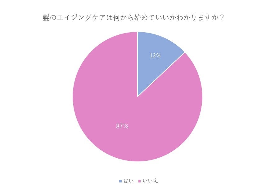 ⇒「『いいえ』と答えた方に質問です。髪のエイジングケアは何から始めていいかわかりますか?」の質問には【87%】の方がわからないと回答。悩みはあるけれど、「何がいいのかわからない…」、「何から始めていいかわからない…」という方が多いのかもしれません。