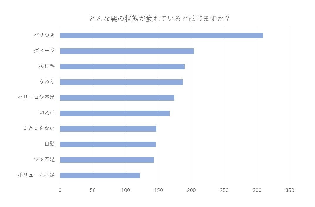 ⇒「パサつき」という回答が最も多く、それ以降は「ダメージ」「抜け毛」「うねり」「ハリ・コシ不足」「切れ毛」などの回答があげられ、複数のお悩みを挙げている方がほとんどでした。皆さま様々な理由で髪が疲れていると感じていることが分かりました。