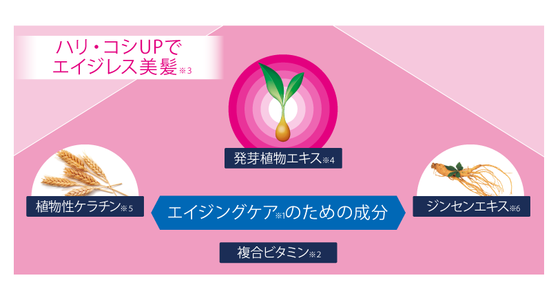※1 年齢に応じたケア ※2 パンテノール、ビチオン、パントテン酸Ca、レチノール、酢酸トコフェロール(補修)/トリートメントスプレーは除く ※3 しなやかな髪のこと ※4 コムギ胚芽エキス(保湿) ※5 ヒドロキシプロピルトリモニウム加水分解コムギタンパク ※6 オタネニンジン根エキス