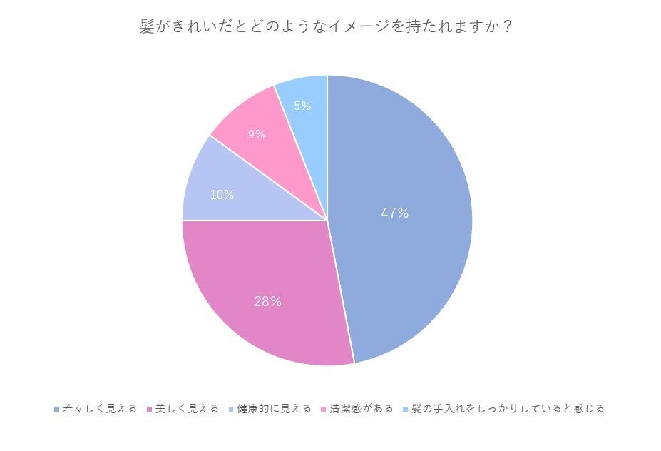 ⇒「若々しく見える」という回答が最も多く半数近くを占め、続けて「美しく見える」「健康的に見える」といった意見が挙がりました。髪がきれいだとそれだけでぐっと全体の印象もよく見えますよね!