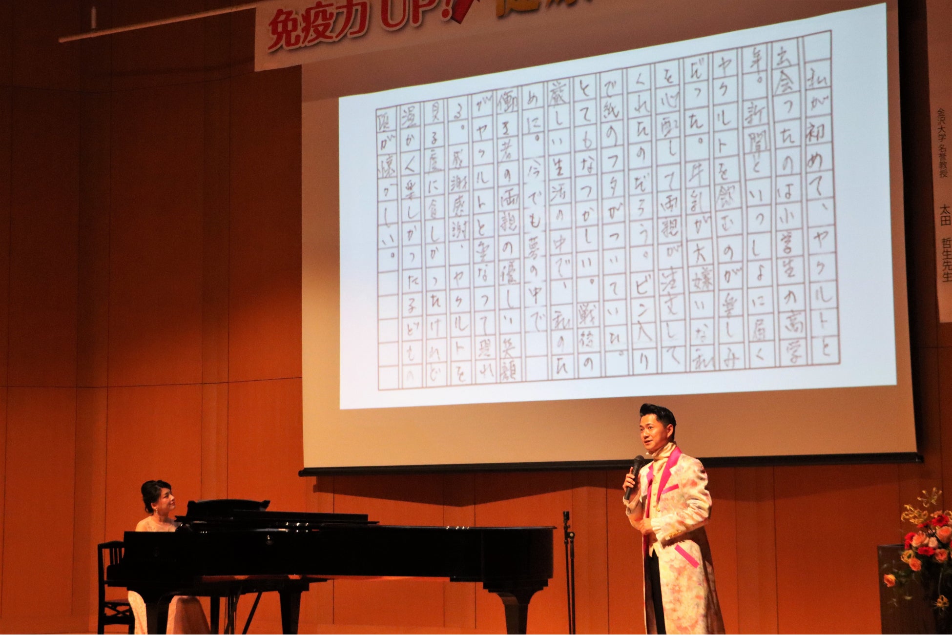 免疫力UP!ミニコンサートでは、橋本氏の美しい歌声が観客を魅了し、トークでは場内を沸かせる笑いを起こし、心地よい声でのエッセイ朗読で涙を誘い、人々の感情を揺さぶる笑いあり涙ありのステージショーを披露いただきました。また、垂水区会場のコンサートでは、ピアニストの北野友梨さまにもご出演いただき、歌声とピアノの音色でさらに観客を魅了するステージとなりました。