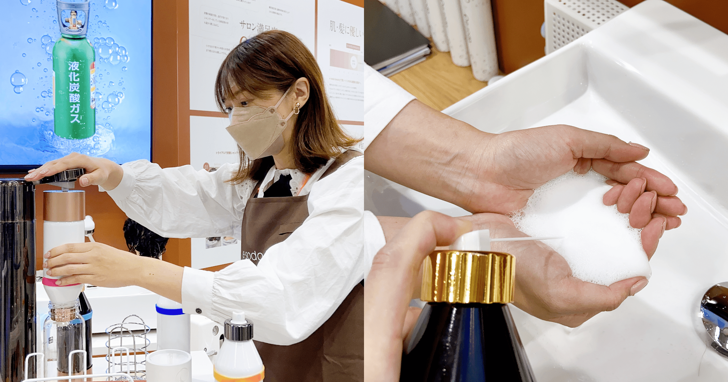 お店でe-soda beautyをつかって、簡単に炭酸シャンプー・美容液をつくる体験をこの機会にぜひお試しください。