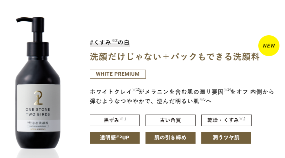 美容ブランド「ONE STONE TWO BIRDS」からこの秋発売された新商品、『洗顔だけじゃない+パックもできる洗顔料 ホワイトプレミアム』は「ホワイトクレイ」を始めとする4種のクレイ*7を配合し、洗顔と角質ケアが一本でできる洗顔料です。洗顔アイテムや手順を増やさずに気軽に角質ケアを行うことができます。