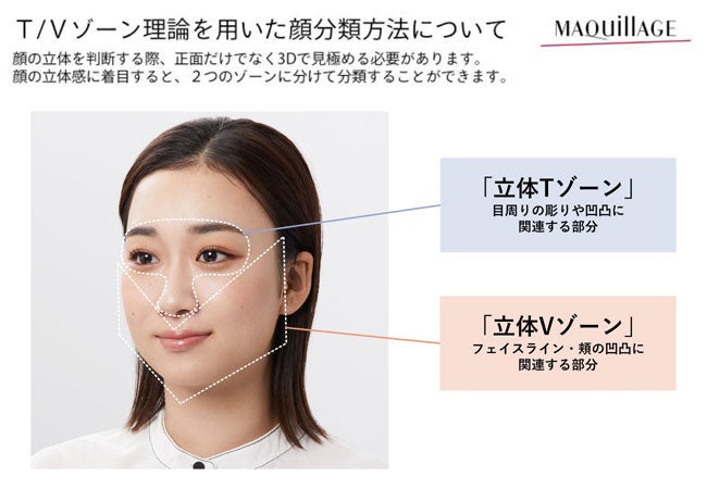 資生堂独自のT/Vゾーン理論を用いた顔分類方法*1。鼻筋・眉下部分の「立体Tゾーン」と、フェイスライン・頬骨部分の「立体Vゾーン」の特長点を測定。顔の立体情報を基にした分類と、顔のパーツの形態と配置バランスなどに基づいた顔分類方法*2 を組み合わせて、全24タイプに分類します。当技術を活用した体験コンテンツはパーソナルビューティーチェック以外にも、順次資生堂webサイトなどで公開予定です。