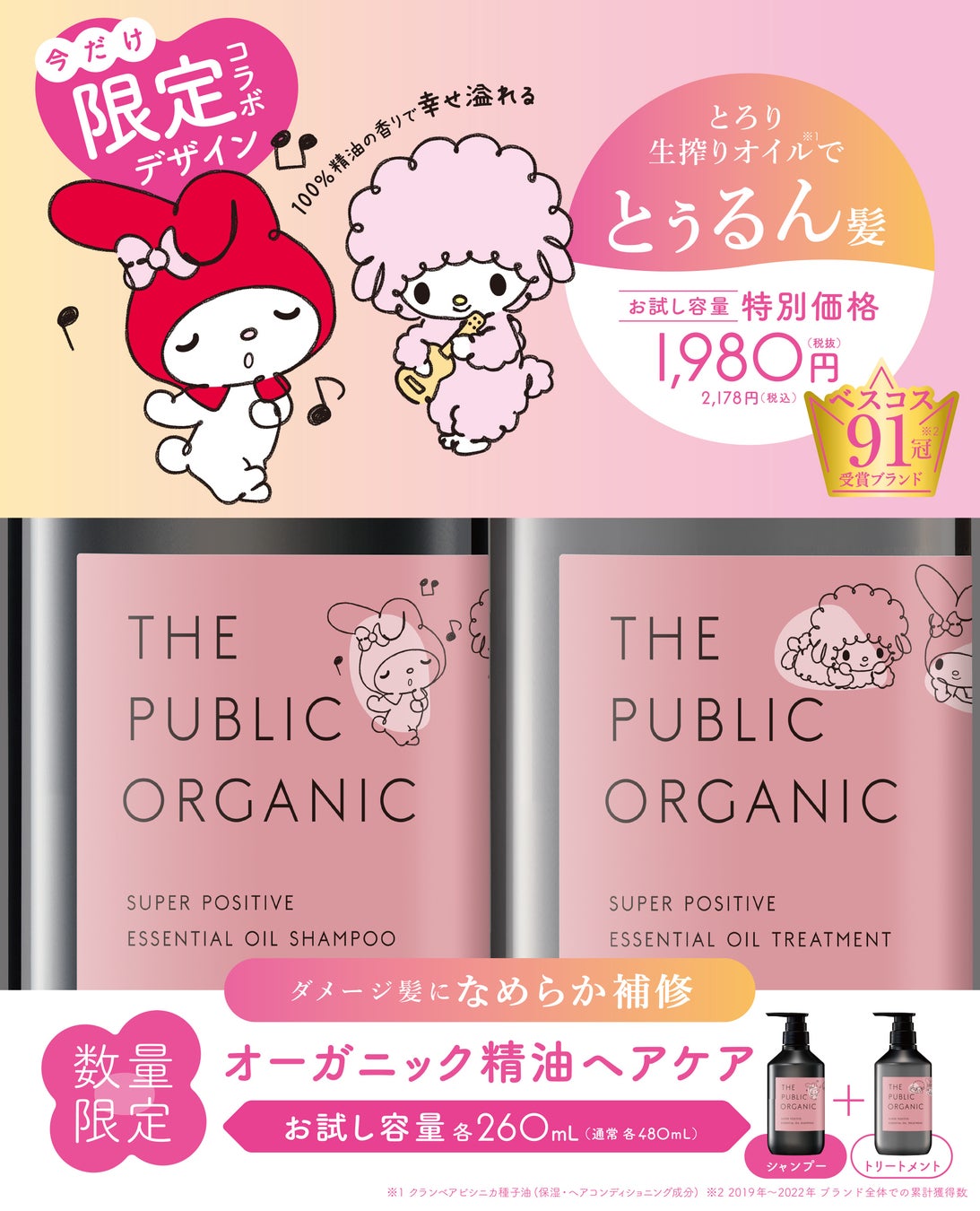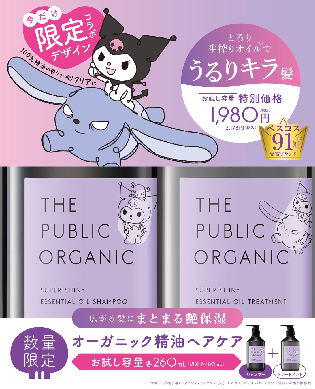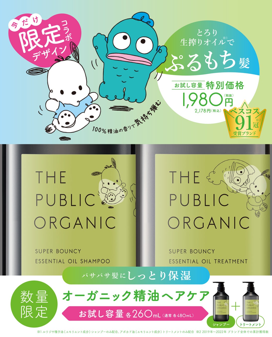 ベストコスメ91冠※1ブランドのザ パブリック オーガニックが幅広い世代に愛される株式会社サンリオのキャラクターと初のコラボレーション。大人気のサンリオキャラクターの世界観とパッケージカラーがマッチした、オトナ可愛い限定デザインボトルのお試し容量セット(シャンプー &トリートメント)3シリーズを数量限定で発売いたします。