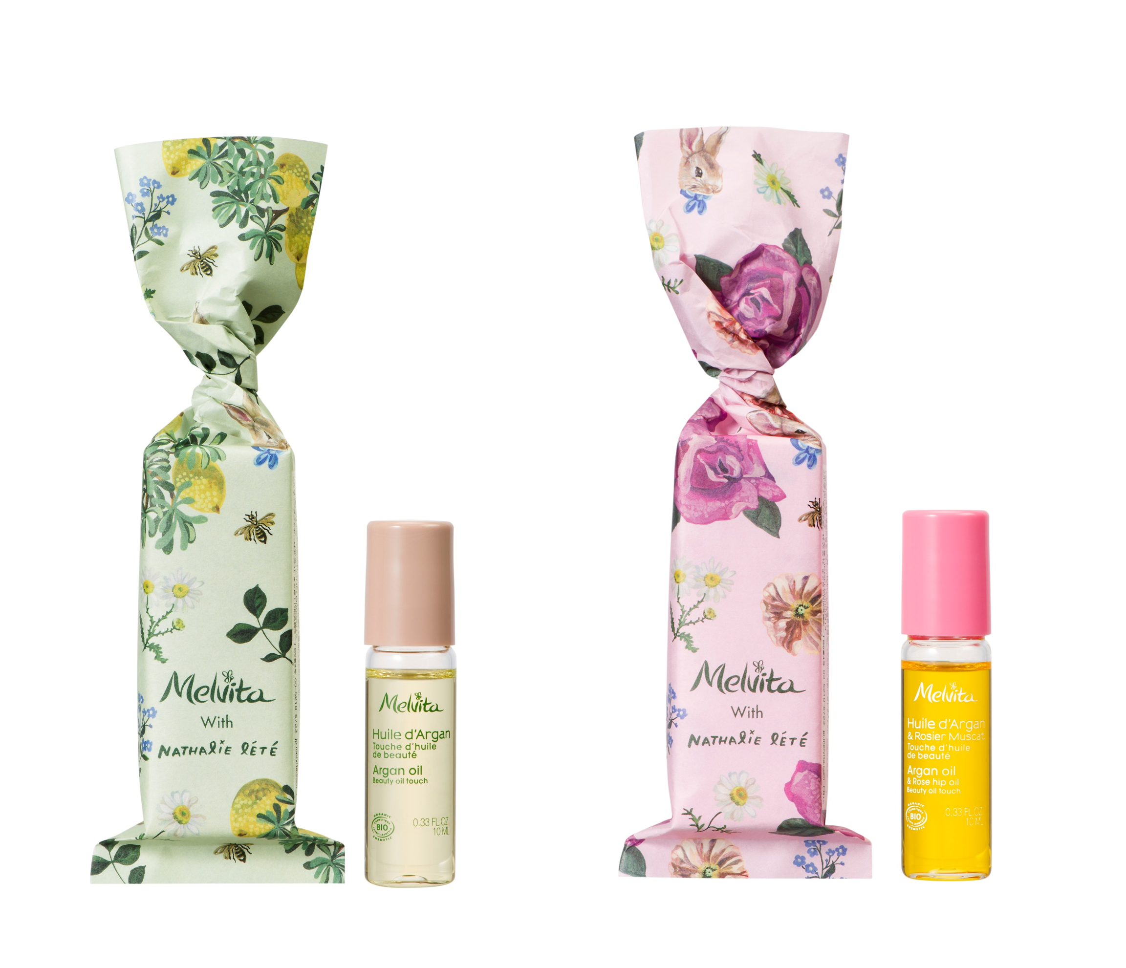 ナタリー・レテが描き下ろしたラパンを大胆にあしらった巾着ポーチに、メルヴィータのベストセラー「ビオオイル アルガンオイル」の中でも特別なシーズンにしか手に入らない香り「リリーオブザバレー」とビーガン処方のハンドクリームをセット。