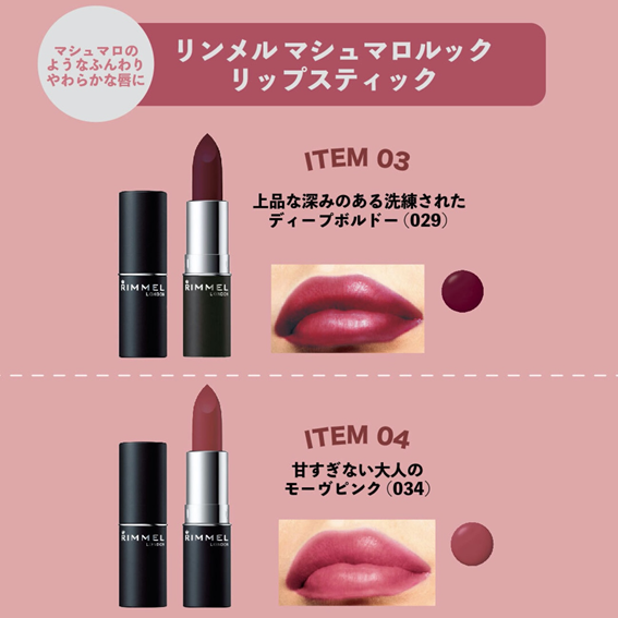上品な深みのある洗練されたディープボルドー、甘すぎない大人のモーヴピンク、ともにマシュマロのようなふんわりやわらかな唇に。