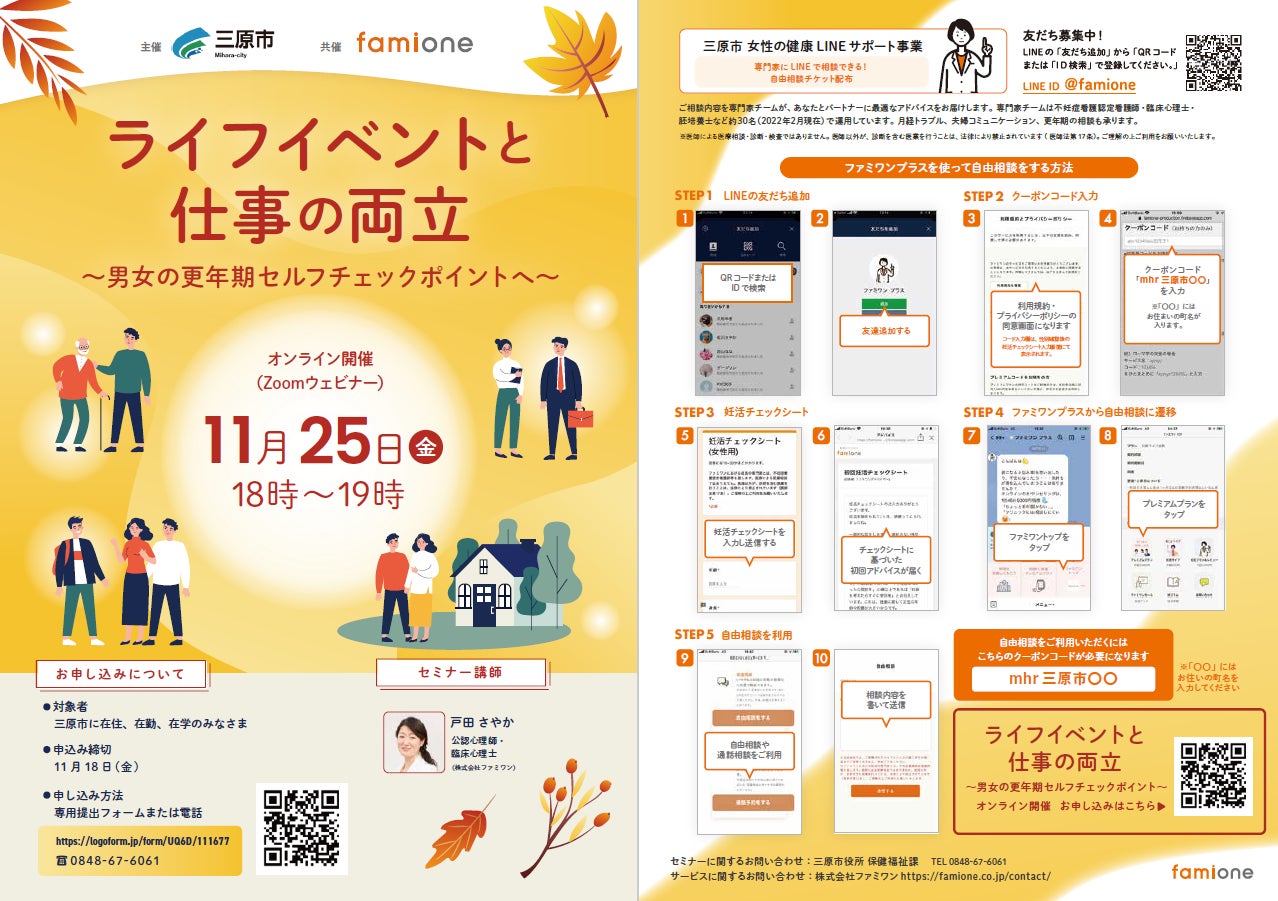 「子どもを願うすべての人によりそい幸せな人生を歩める社会をつくる」をビジョンに掲げ、LINEを活用した妊活コンシェルジュサービス「famione(ファミワン)」 https://lp.famione.com/ を提供する株式会社ファミワン(本社:東京都渋谷区、代表取締役:石川勇介、以下当社)は、広島県三原市(市長:岡田 吉弘)からの委託を受け、「女性の健康LINEサポート事業」において、「ライフイベントと仕事の両立」~男女の更年期セルフチェックポイント~を開催します。
