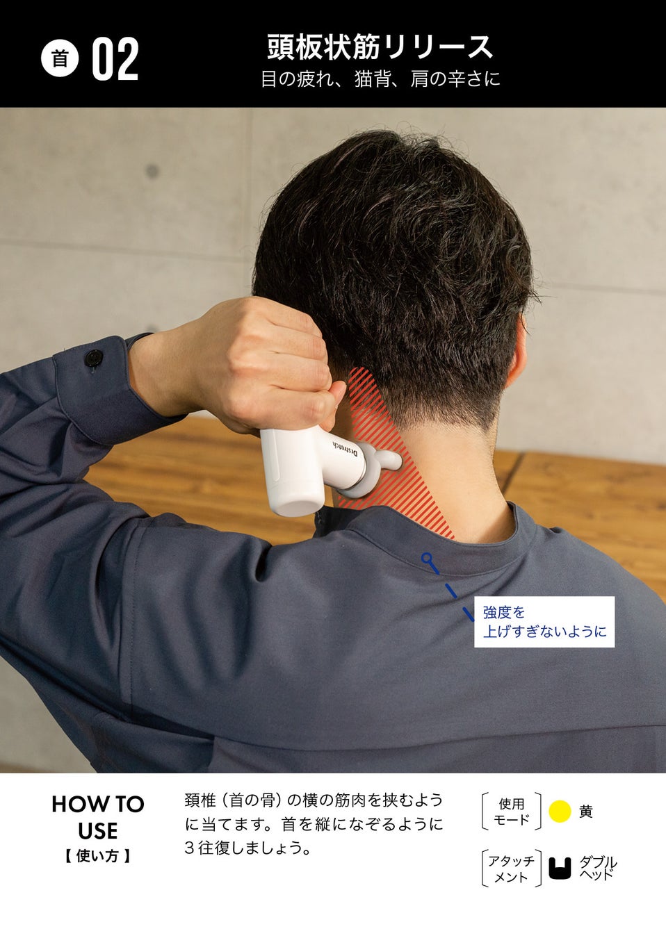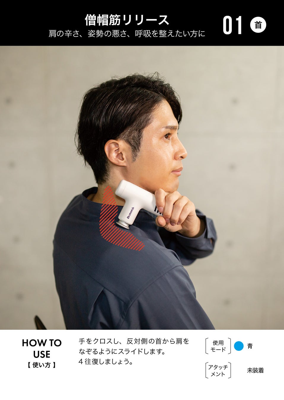 本商品を購入すると付属する「使い方ガイド」は、Dr.stretch全面監修ならではの特典です。マッサージガンを初めて使用する方でも気軽にご使用頂ける様、首・腕・脚など23か所の筋肉に応じた「使い方」「アタッチメント」「使用モード」が記載されており、個々のライフスタイルに合わせて様々な場面でご使用いただけます。