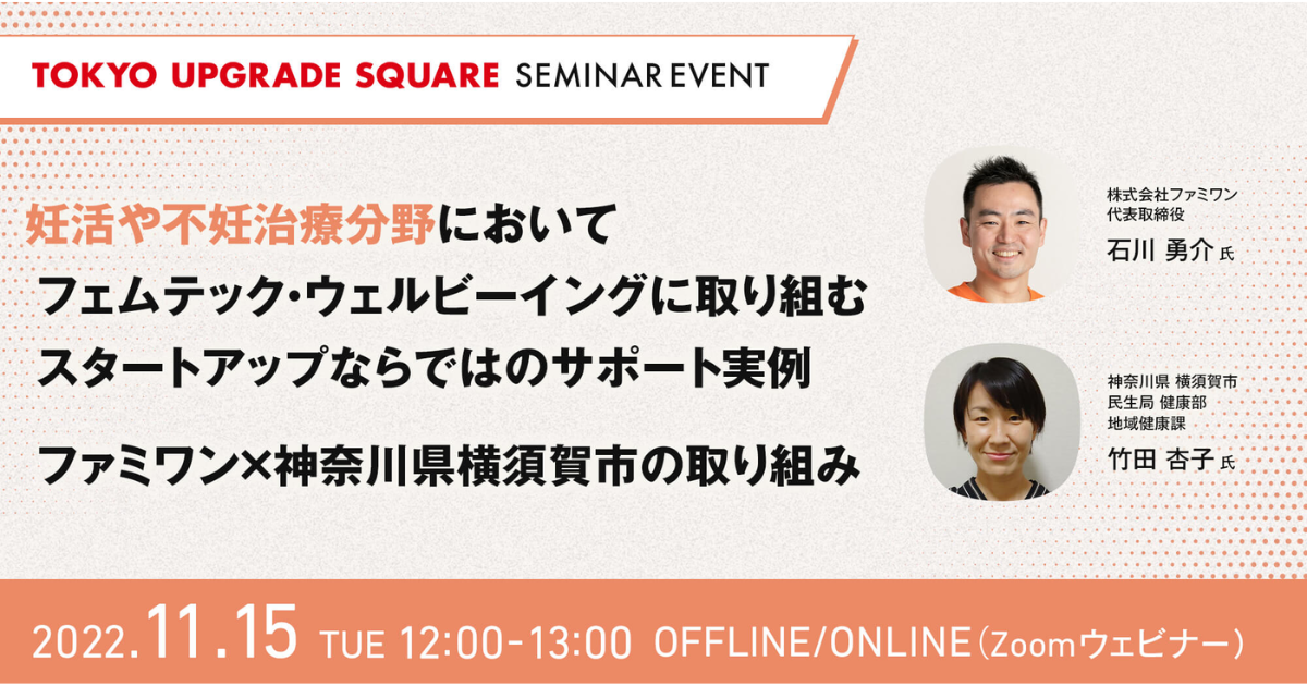 「子どもを願うすべての人によりそい 幸せな人生を歩める社会をつくる」をビジョンに掲げ、LINEを活用した妊活コンシェルジュサービス「famione(ファミワン)」 https://lp.famione.com/ を提供する株式会社ファミワン(本社:東京都渋谷区、代表取締役:石川勇介、以下当社)の代表石川は、11月15日に東京都が開催する「TOKYO UPGRADE SQUARE」のセミナー https://upgrade-square.jp/event/comfirm/105 に登壇いたします。
