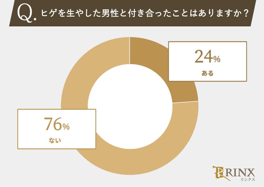 ヒゲなし派の252人への「ヒゲを生やした男性と付き合ったことはありますか?」という問いには、「ない」と回答した割合が76%、「ある」と回答した割合は24%(20代:19%、30代:26%)でした。