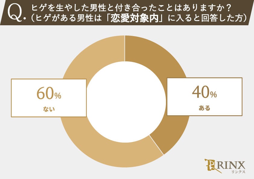 ヒゲがある男性が恋愛対象内に入る方で、実際に付き合ったことが「ある」と回答した女性の割合は40%、「ない」と回答した女性の割合は60%という結果に。