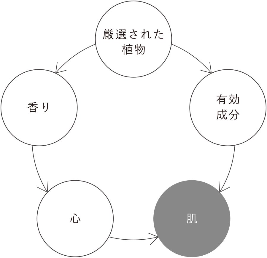 豊かな自然がもたらす恵みで 肌本来の力を高める 五感で香りを感じて 肌と心を共鳴させる 自然のリズムと調和し 自分らしさを取り戻す 肌と向き合いゆらがない自立した肌へ