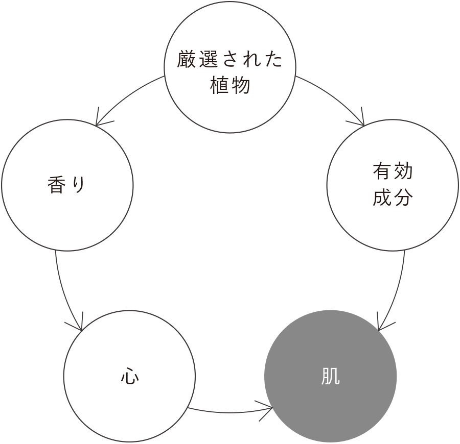 豊かな自然がもたらす恵みで 肌本来の力を高める 五感で香りを感じて 肌と心を共鳴させる 自然のリズムと調和し 自分らしさを取り戻す 肌と向き合いゆらがない自立した肌へ