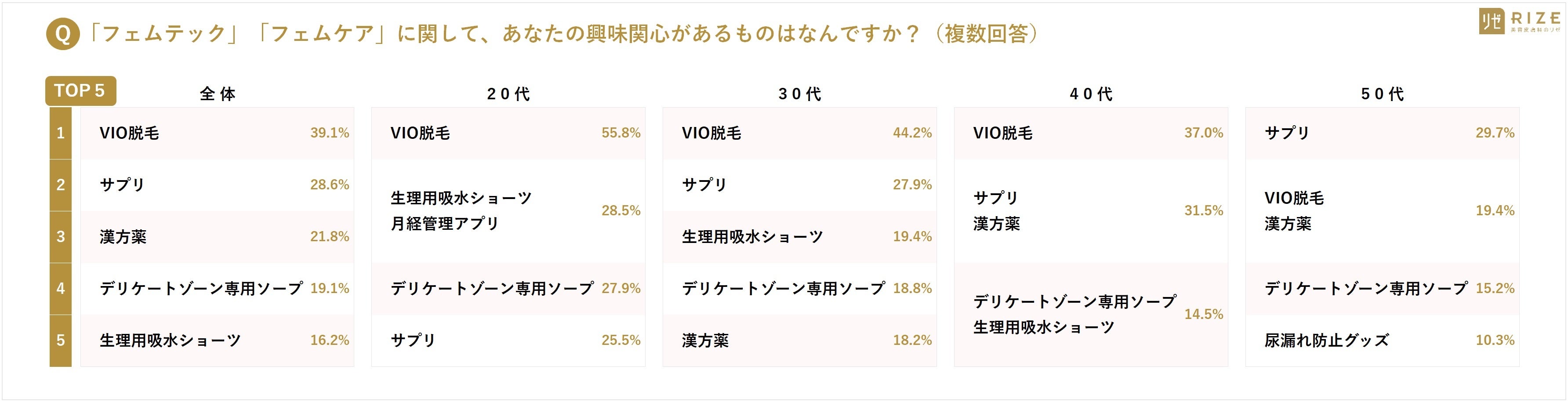 - ◆②【フェムテック・フェムケアの中で興味関心があるものは?】「VIO脱毛」がトップ回答に(39.1%)