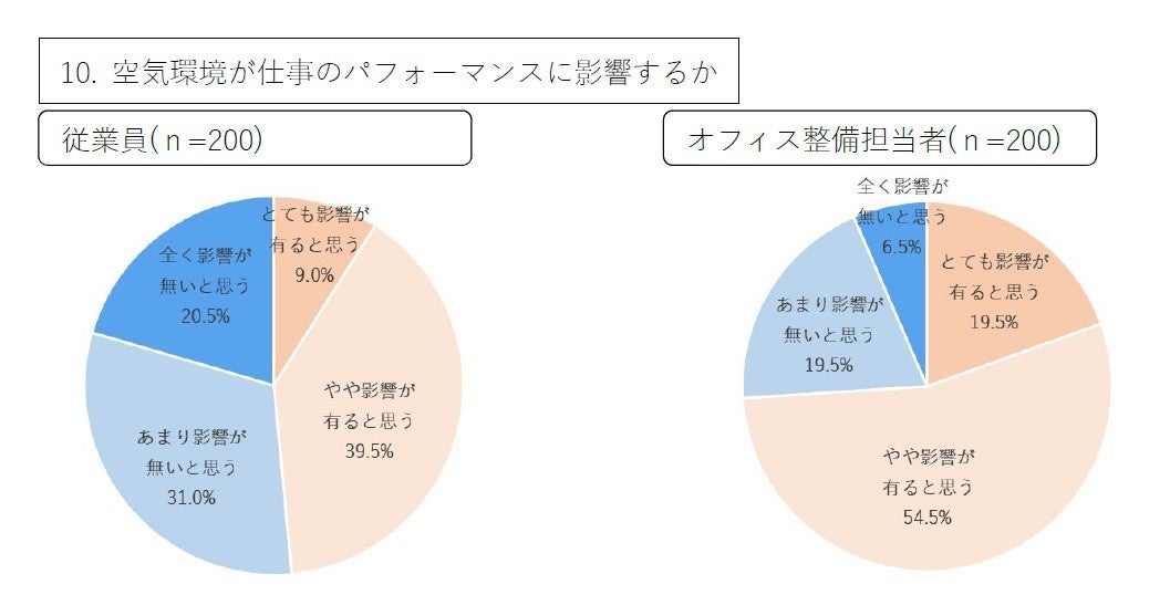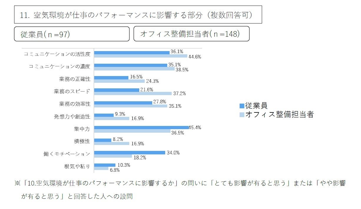 - 10. 従業員の48.5%、オフィス整備担当者の74.0%がオフィス内の空気環境が仕事のパフォーマンスに影響すると回答。