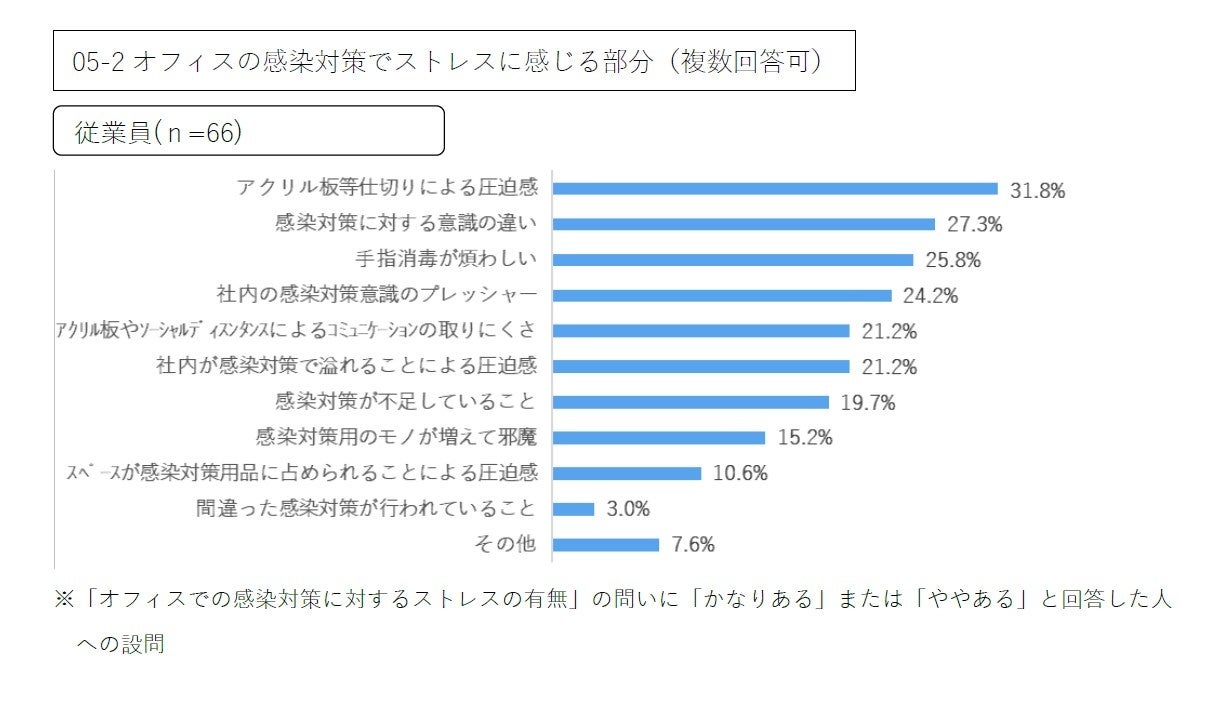 - 05. 従業員の38.1%がオフィスでの感染対策にストレス。ストレスを感じる部分で多いのは「アクリル板等仕切りによる圧迫感」31.8%、「感染対策に対する意識の違い」27.3%
