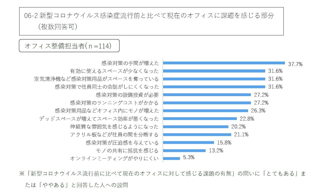 - 06. 新型コロナウイルス感染症流行前と比べて現在のオフィスに課題を感じるオフィス整備担当者は57.0%。課題上位3つは、「感染対策の手間が増えた」37.7%、「有効に使えるスペースが少なくなった」31.6%、「空気清浄機など感染対策用品がスペースを奪っている」31.6%。