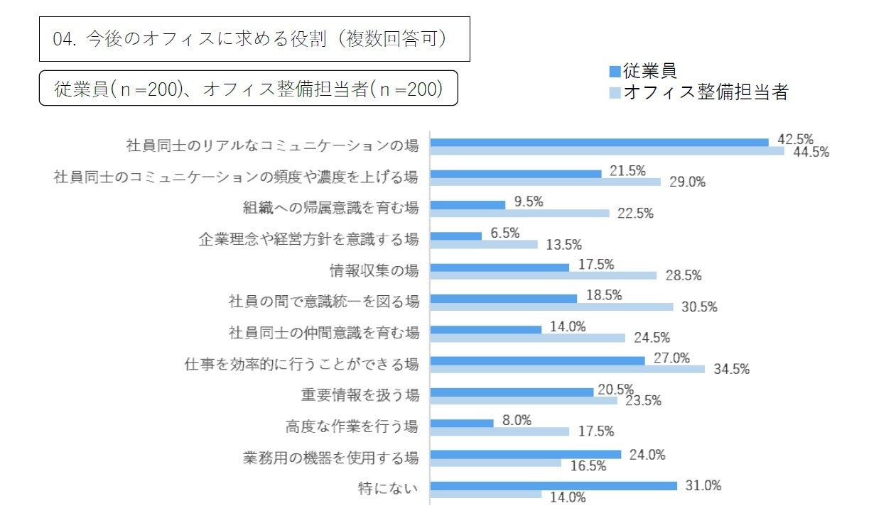 - 04. 「今後オフィスに期待する役割」の第1位は「社員同士のリアルなコミュニケーションの場」で従業員(42.5%)、オフィス整備担当者(44.5%)の最上位回答が一致。