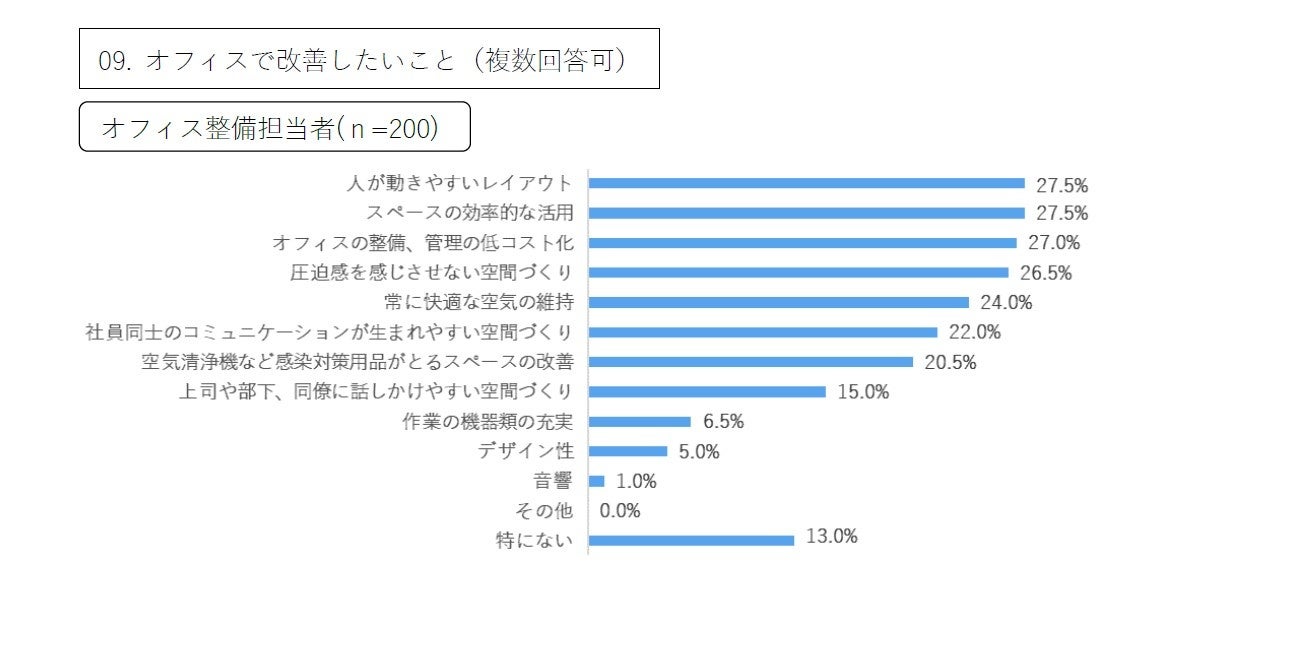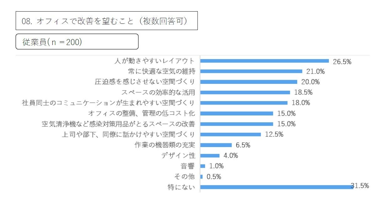 - 08. オフィスについて改善の必要性を感じることとして従業員の上位3点は、「人が動きやすいレイアウト」26.5%、「常に快適な空気の維持」21.0%、「圧迫感を感じさせない空間づくり」20.0%。「特にない」という人は31.5%で、何らかの改善点を上げた人が68.5%。