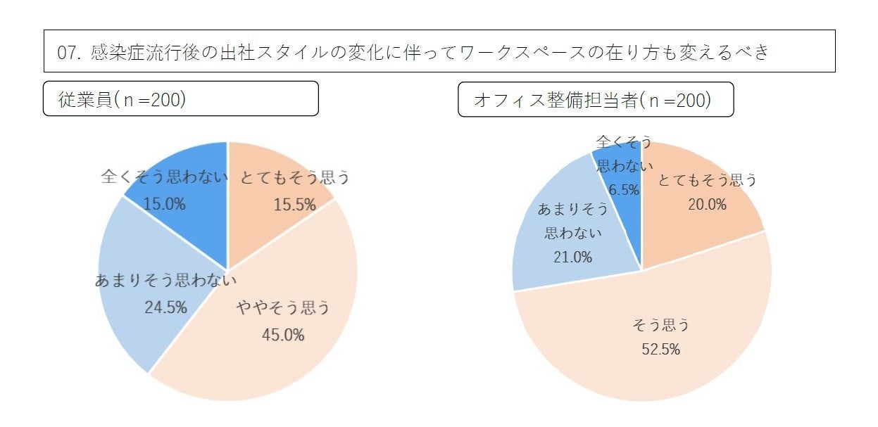- 07.「新型コロナウイルス感染症流行後の出社スタイルの変化に伴いワークスペースの在り方も変えるべき」と従業員の60.5%、オフィス整備担当者の72.5%が回答。