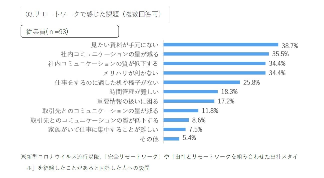 - 03. 従業員がリモートワークで感じた課題で最も多いのは「見たい資料が手元にない」38.7%で社内コミュニケーションの「量が減る」35.5%「質が低下する」34.4%が続く