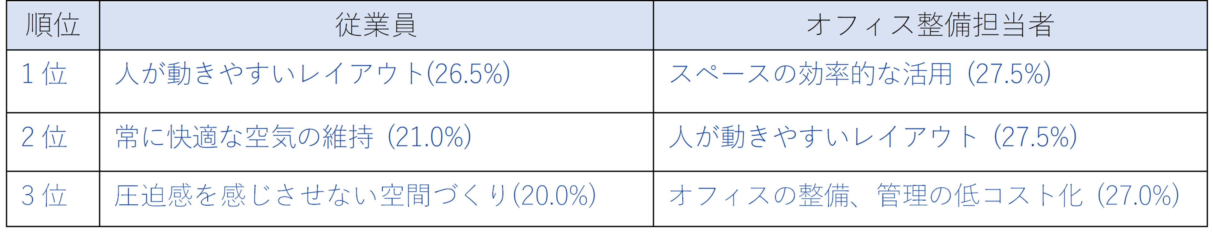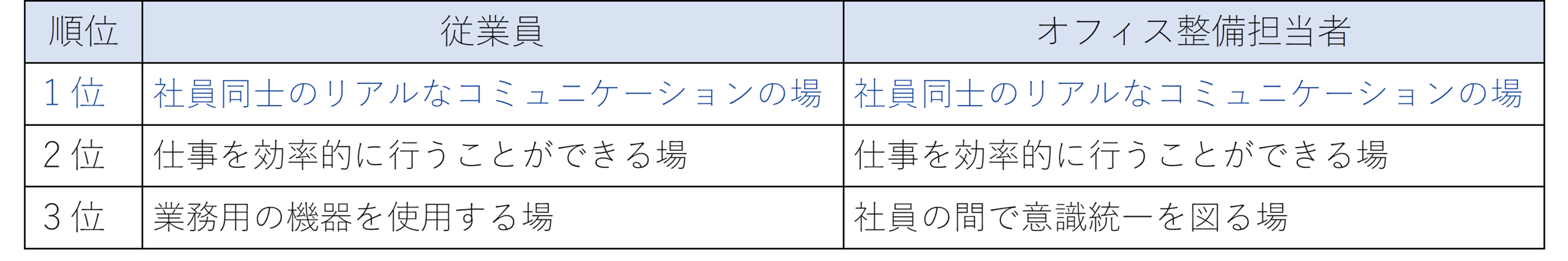 - 「今後オフィスに期待する役割」の第1位は「社員同士のリアルなコミュニケーションの場」で従業員(42.5%)、オフィス整備担当者(44.5%)の最上位回答が一致。