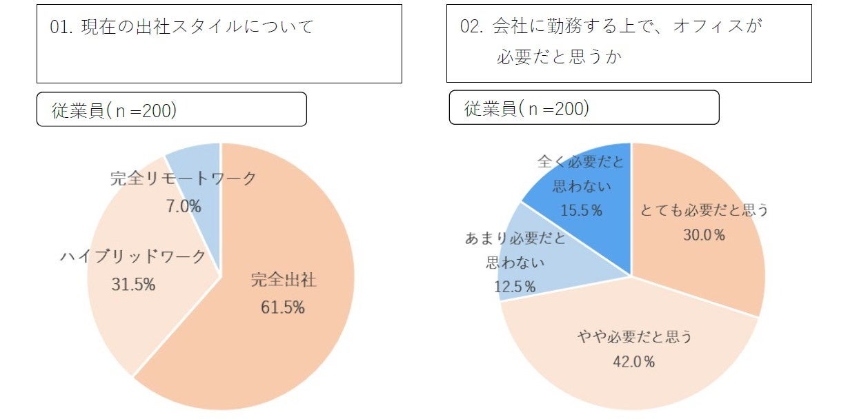 - 現在、オフィスに出社している従業員は93.0%(完全出社: 61.5%、ハイブリッドワーク:31.5%)、従業員の72.0%が会社に勤める上でオフィスが必要と回答。
