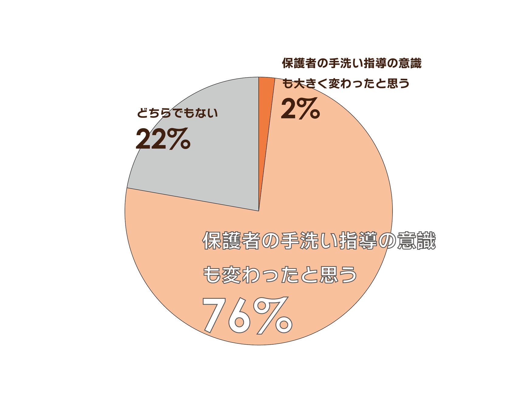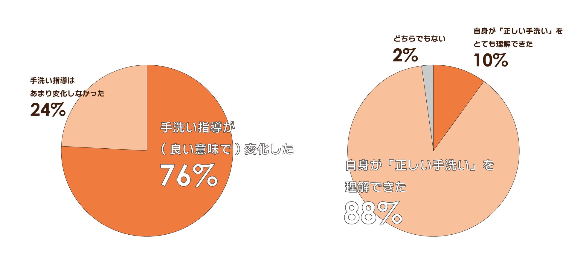 また、家庭内での手洗い意識の変化は全体の約8割ほどで見られた。「歌を歌いながら手洗いを促す」など保護者が手洗い指導に本プロジェクトを活用する事例も見られた。