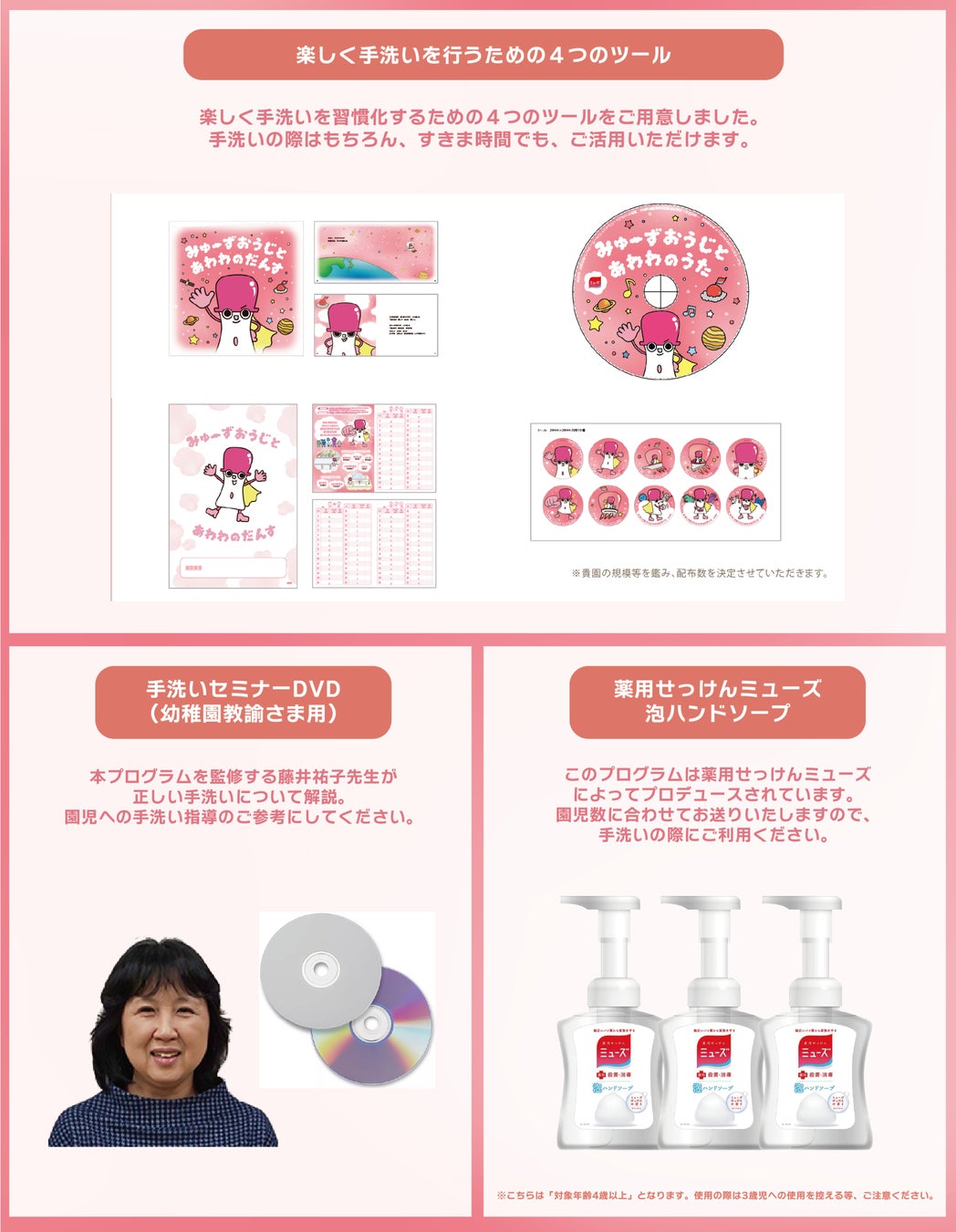 ※参加園決定後、順次(1)薬用せっけんミューズ 泡ハンドソープ (2)プログラムツール4種 (3)手洗いセミナーDVDをご提供させていただきます。また各年齢(年少・年中・年長)ごとに目標設定を設けることで、段階的に園児の成長に寄与できるような建て付けとしております。