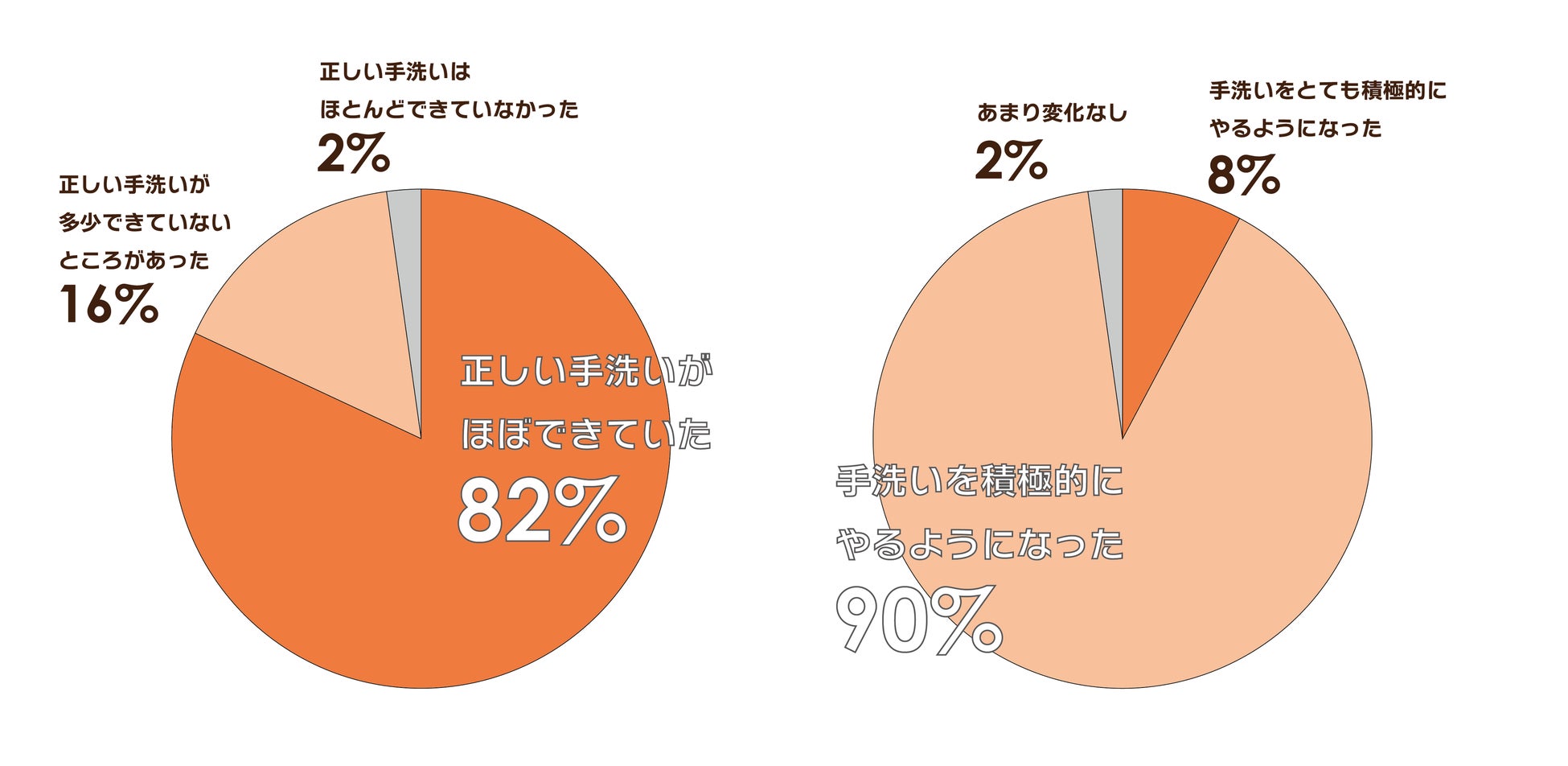 また多くの園で園児の「手洗いへの興味が湧いた」「手洗いを楽しむようになった」などの変化が見られた。 本プログラムによる園児の積極性変化が見られた園ほど興味だけでなく、手洗いの仕方の変化が見られた。