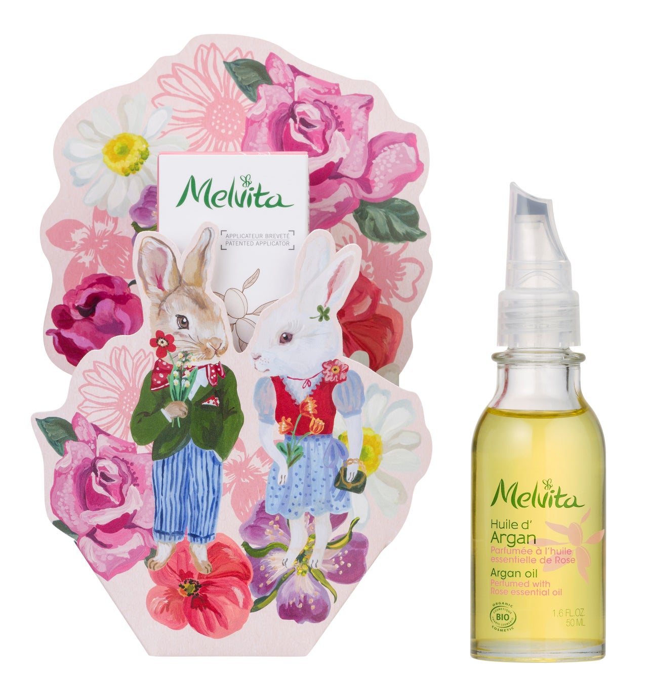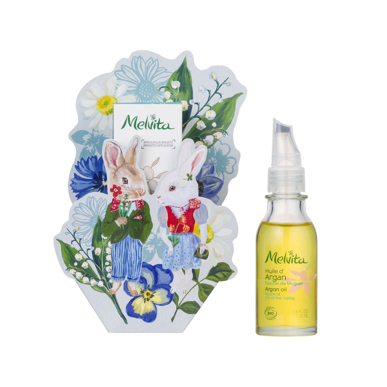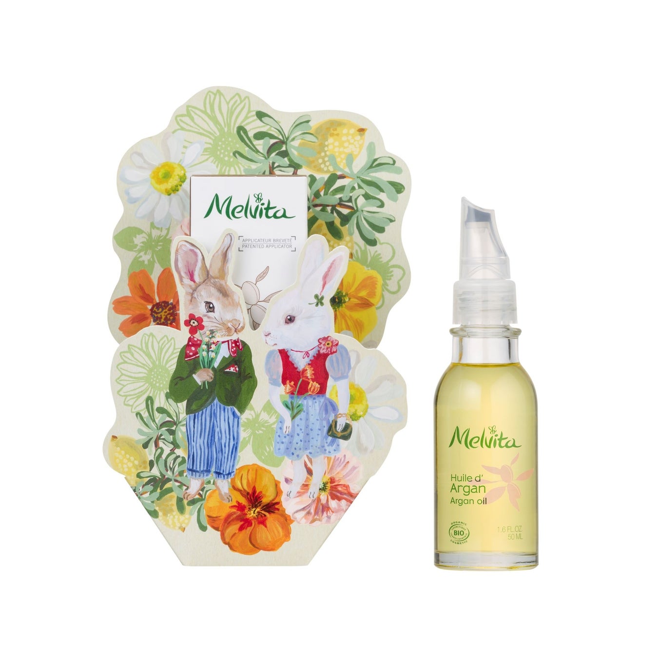 アルデーシュの森の案内人ラパンと、アルガンの実、ローズ、スズランなどが描かれたスリーブをまとった、限定コラボレーションのアルガンオイルが登場。