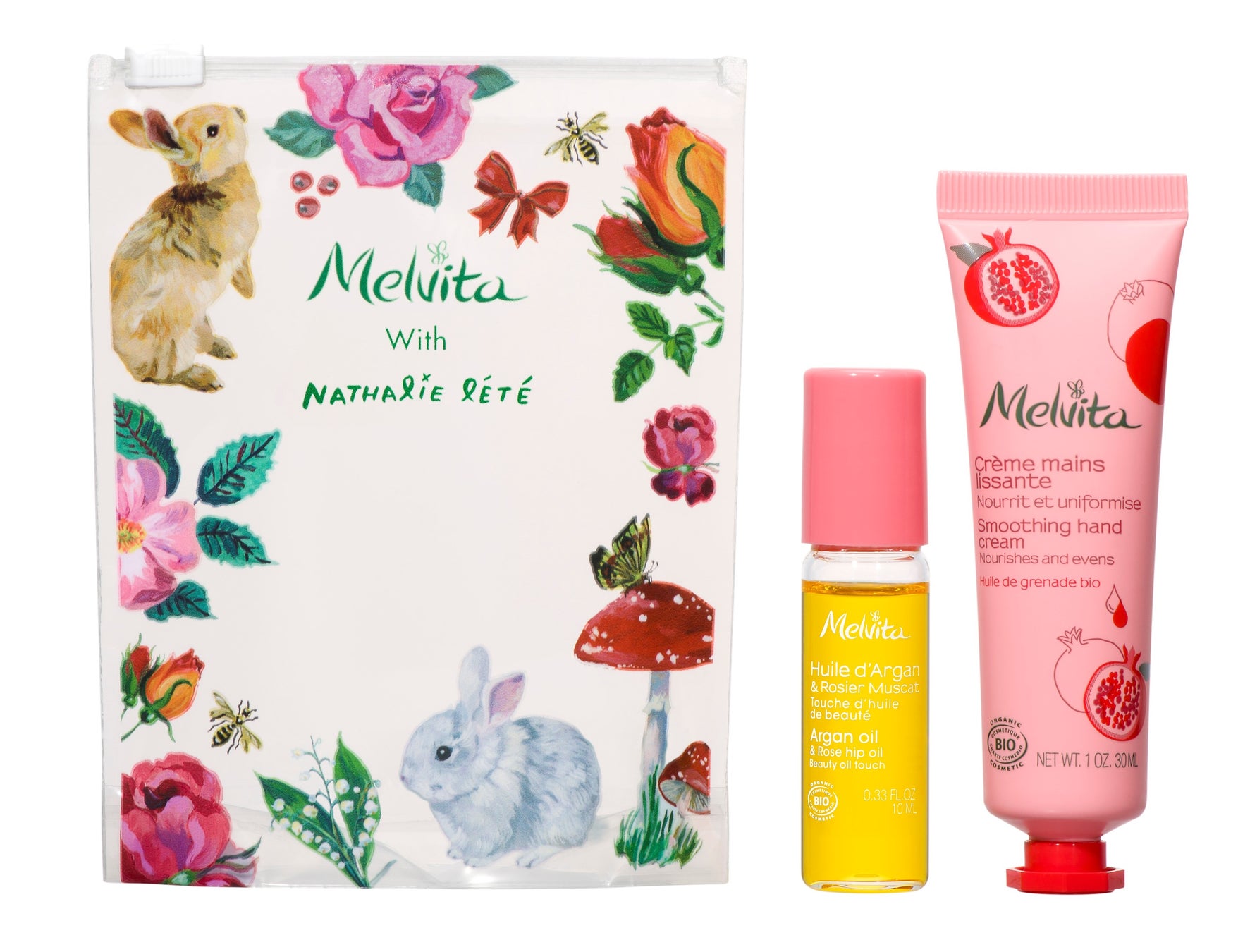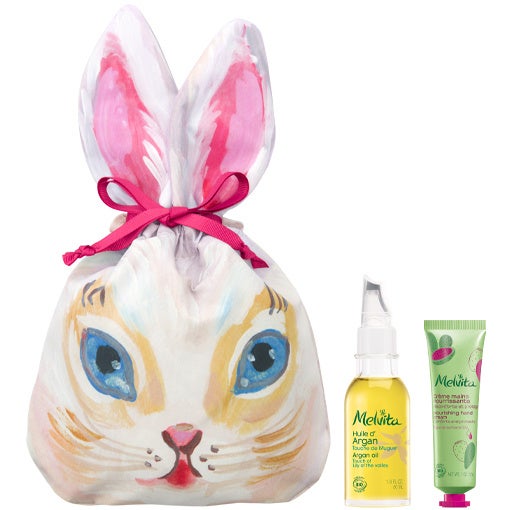 ナタリー・レテ描き下ろしのラパンを大胆にあしらった巾着ポーチにメルヴィータのベストセラー「ビオオイル アルガンオイル」の中でも特別なシーズンにしか手に入らない香り「リリーオブザバレー」とヴィーガン処方のハンドクリームをセット。